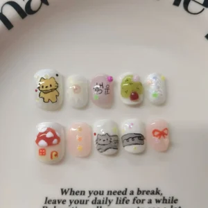 Step into a tiny fairytale with Mushroom Kitty, a 10-piece handmade short press-on nail set that brings whimsical charm to your fingertips. Featuring adorable cartoon kittens, mini mushroom houses, and a soft cat-eye shimmer, each nail feels like a scene from a cozy forest storybook.
