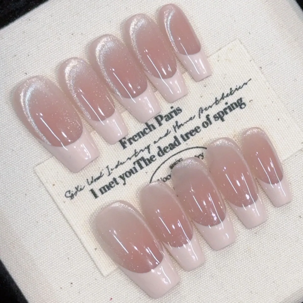 Redefine elegance with this sophisticated 10-piece press-on set. This “Made to Order” collection takes the traditional French manicure and elevates it with a luminous, multidimensional finish. The design features: