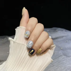 The short round shape keeps the look refined and wearable, while the detailed ceramic-style designs add an elegant, cultured charm. It’s a manicure that feels graceful, artistic, and quietly luxurious.
