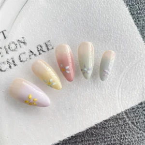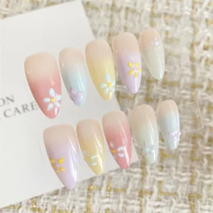 A sweet and elegant handmade press-on nail set featuring soft gradient tones adorned with delicate flower charms. The almond shape creates a graceful, elongated look, while the glossy acrylic finish adds a polished, luxurious touch. Full-cover, lightweight, and reusable—perfect for spring vibes, special occasions, or anyone who loves romantic floral nail art with a gentle, feminine glow. 🌸✨