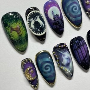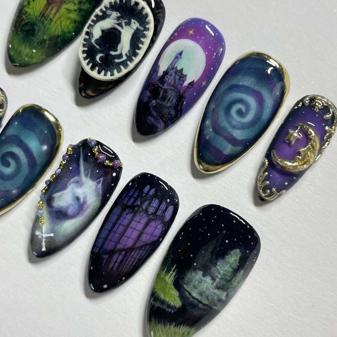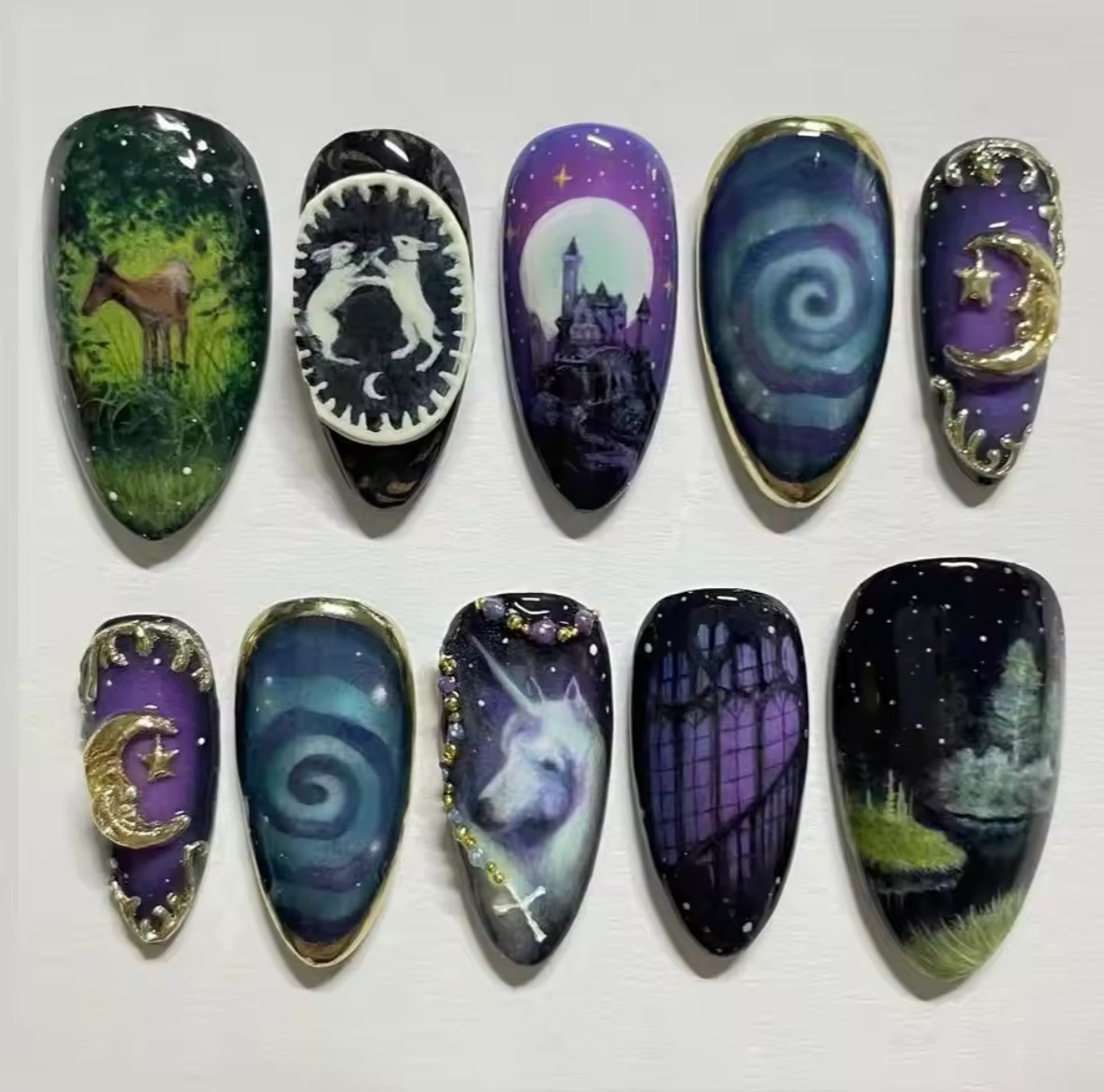 This stunning, hand-painted collection transports you to a realm of dark fantasy, Gothic romance, and cosmic mystery. Each nail is a wearable masterpiece, featuring intricate scenes set under a deep, enigmatic night. Perfect for those who embrace the darker side of magic and celestial wonder.
