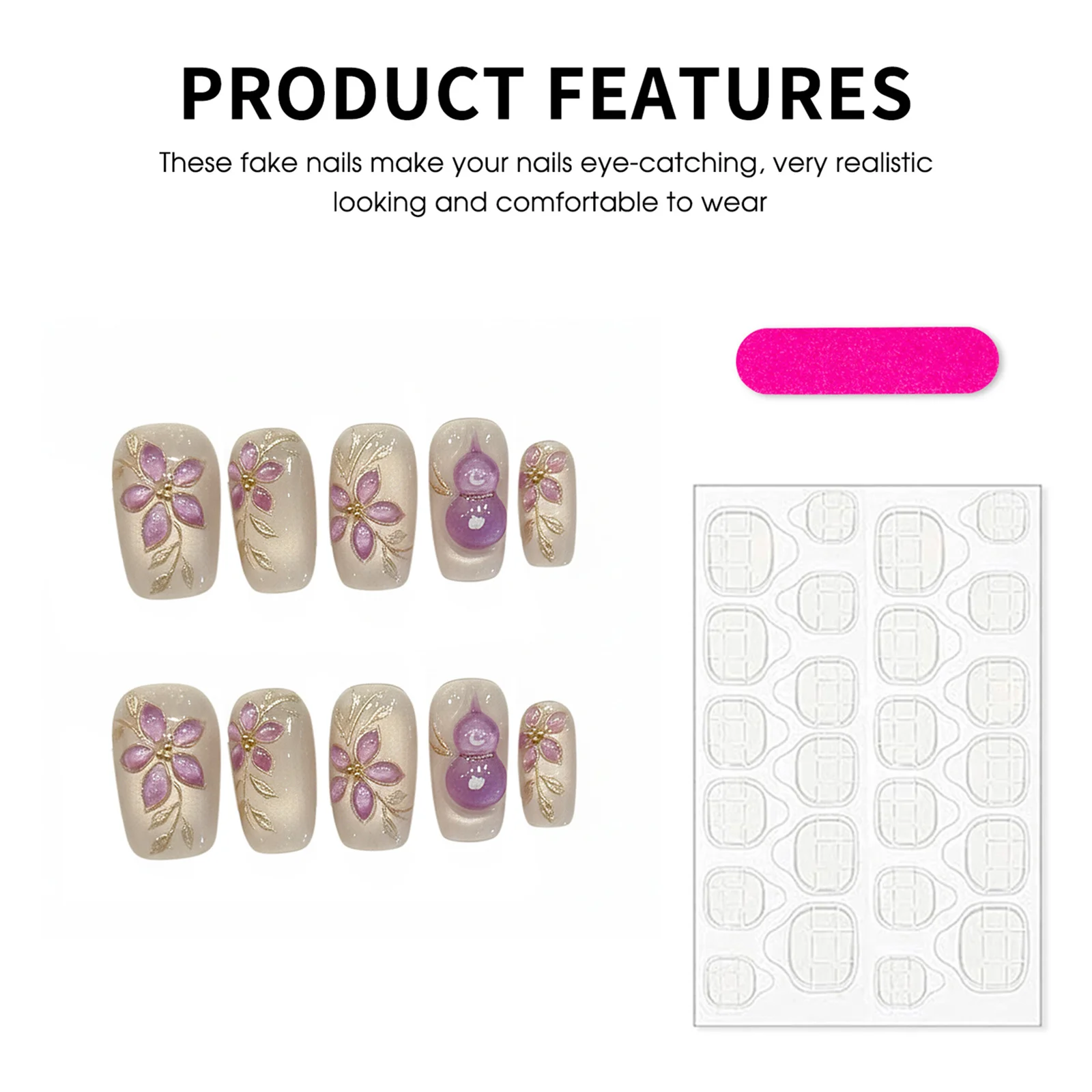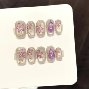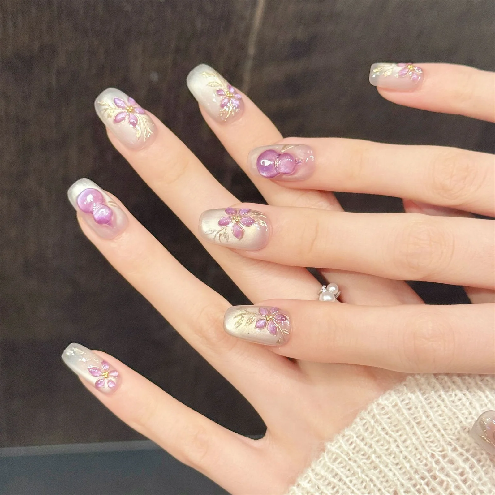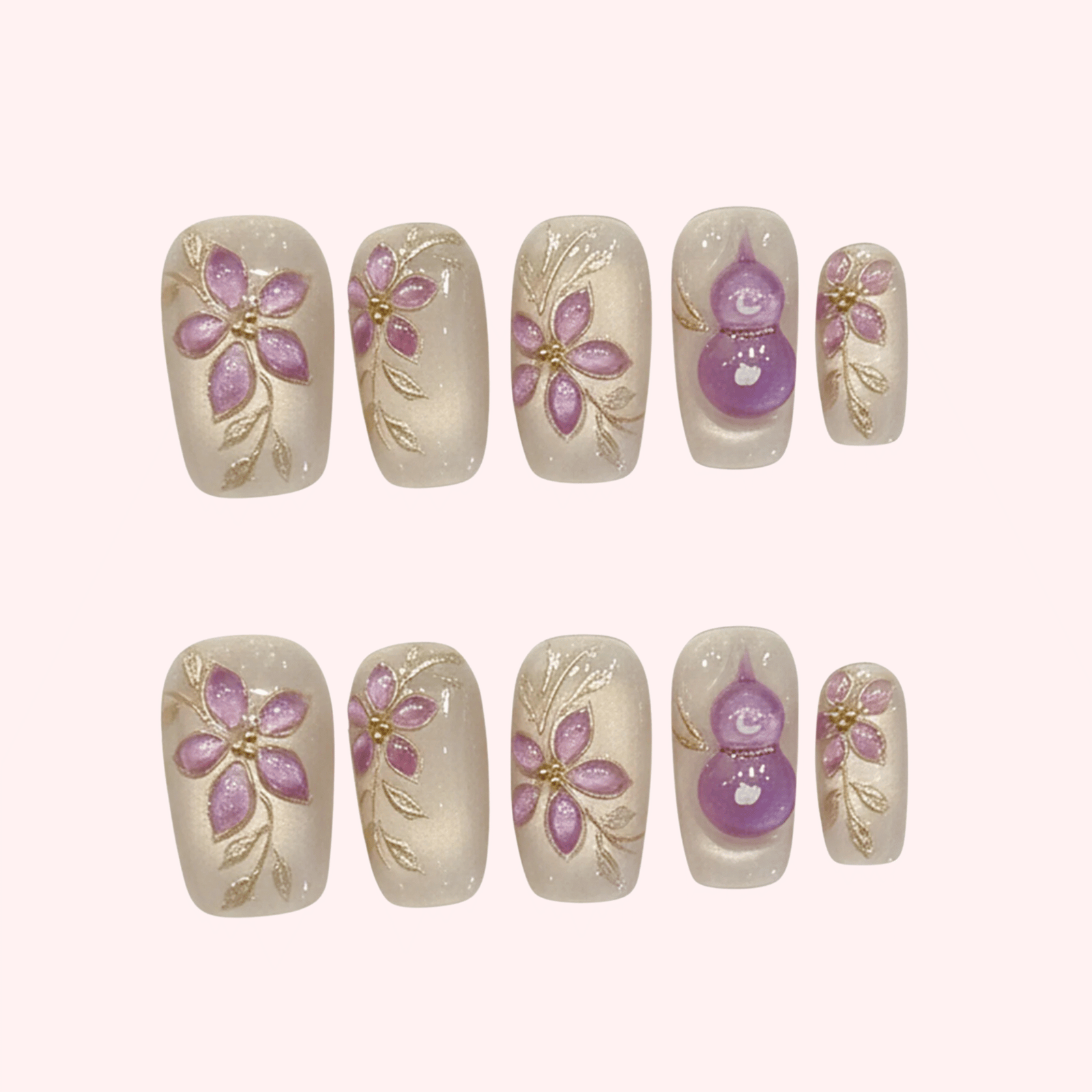 The artistry features delicate 3D lavender petals and a central sculpted violet gourd, a symbol often associated with protection and longevity. Each floral element is detailed with raised gold metallic vines and tiny gold beads at the stamen, adding a regal touch to the soft color palette. Presented in a classic short square silhouette, this set perfectly balances meaningful symbolism with modern, high-shine textures.