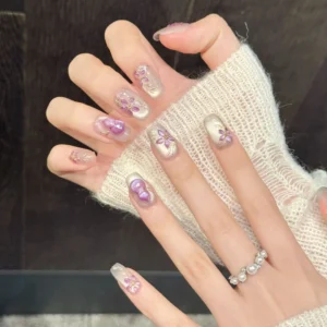 This elegant set combines traditional cultural symbols with a refined, shimmering finish for a look of “quiet luxury”. The design is built on a high-gloss champagne silk cat-eye base, which provides a luminous, multidimensional glow that shifts with the light.