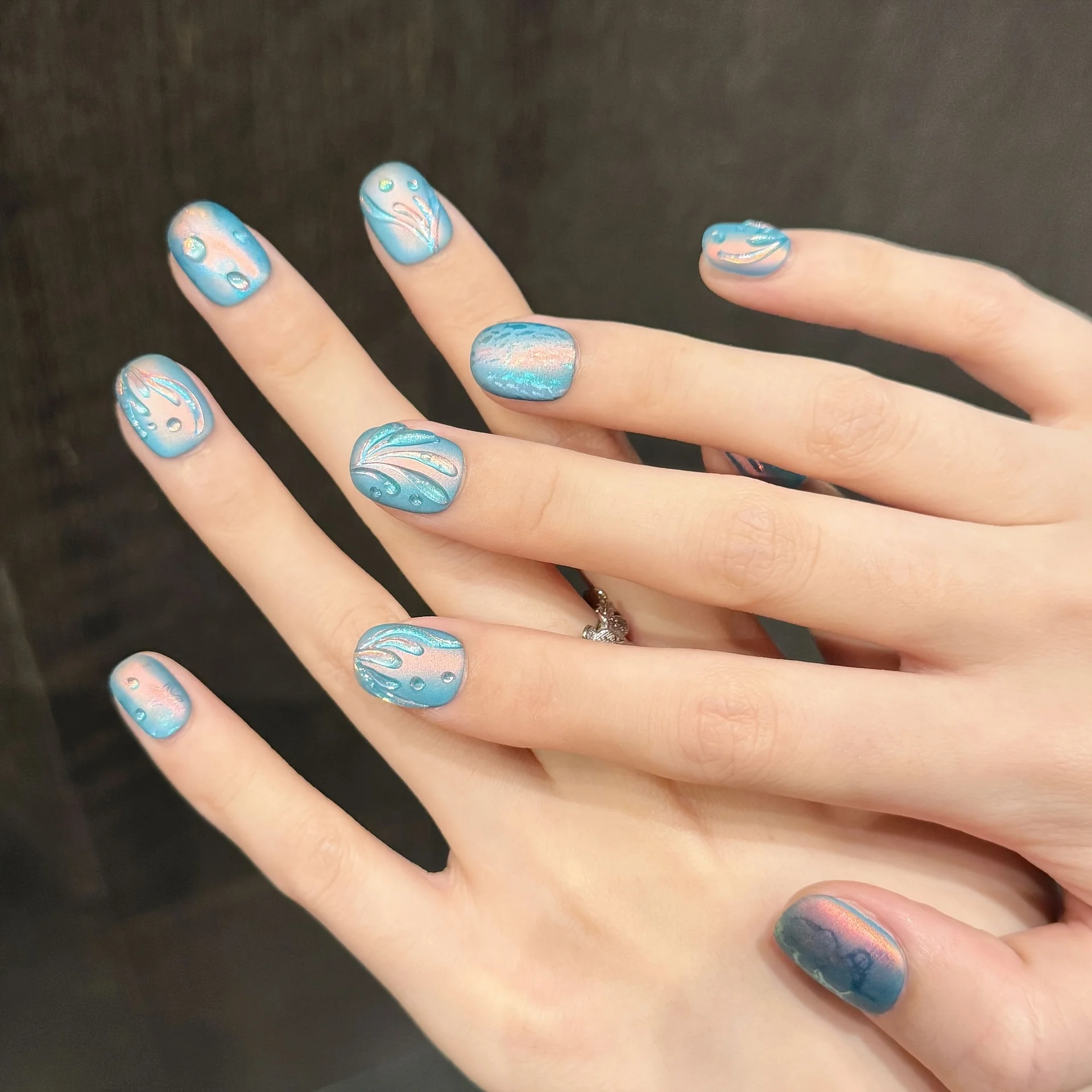 These handmade press-on nails feature a mesmerizing mermaid tears design combined with a magical aurora cat’s eye effect that shifts beautifully under different lighting. The full-coverage style creates a smooth, salon-quality finish while adding depth and shine to your nails.