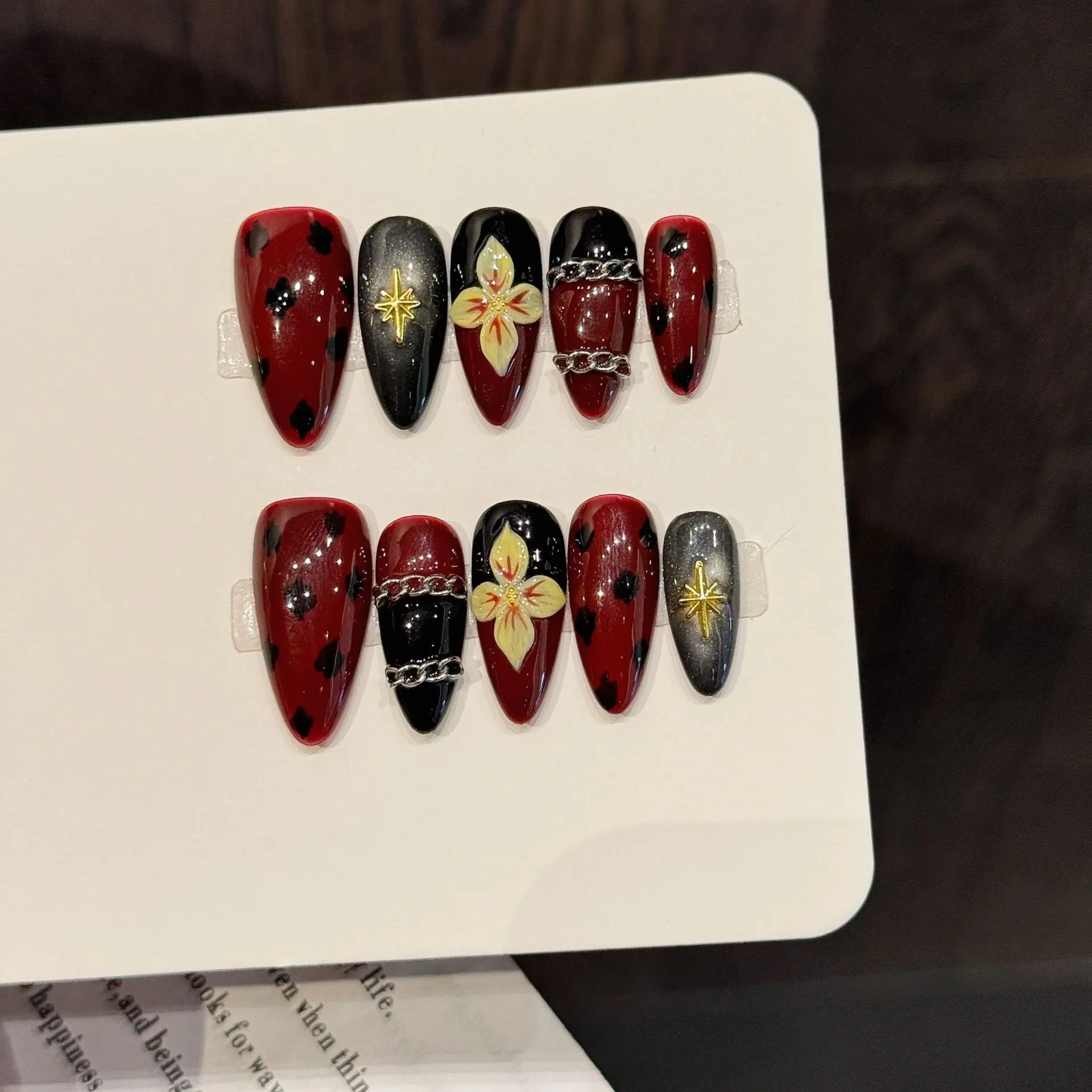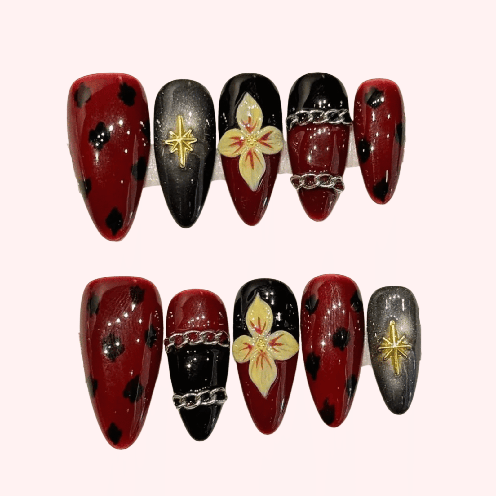 Channel your inner “Spicy Girl” with this edgy and high-contrast 10-piece collection. This set features a bold red and black color story, blending a dark, mysterious aesthetic with vibrant pops of energy. The design is centered around intricate 3D yellow relief flowers that provide a striking textural contrast against the deep base, while industrial-inspired metal chain accents add a touch of punk-rock hardware for a truly cool, street-style finish.