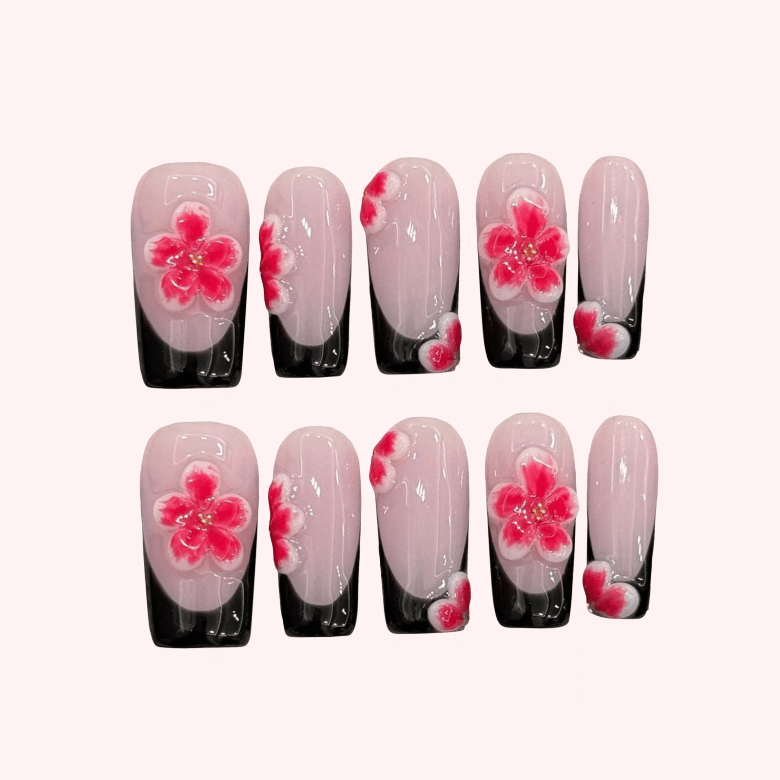 The centerpiece of the set is the vibrant 3D sculpted sakura blossoms in a rich imperial red, each accented with a tiny gold bead at the stamen. These blossoms are strategically placed over the black tips and nude base, accompanied by sculpted white petals that add depth and a sense of movement to the design. Finished in a polished square silhouette, this collection offers a regal and modern take on classic floral nail art.