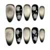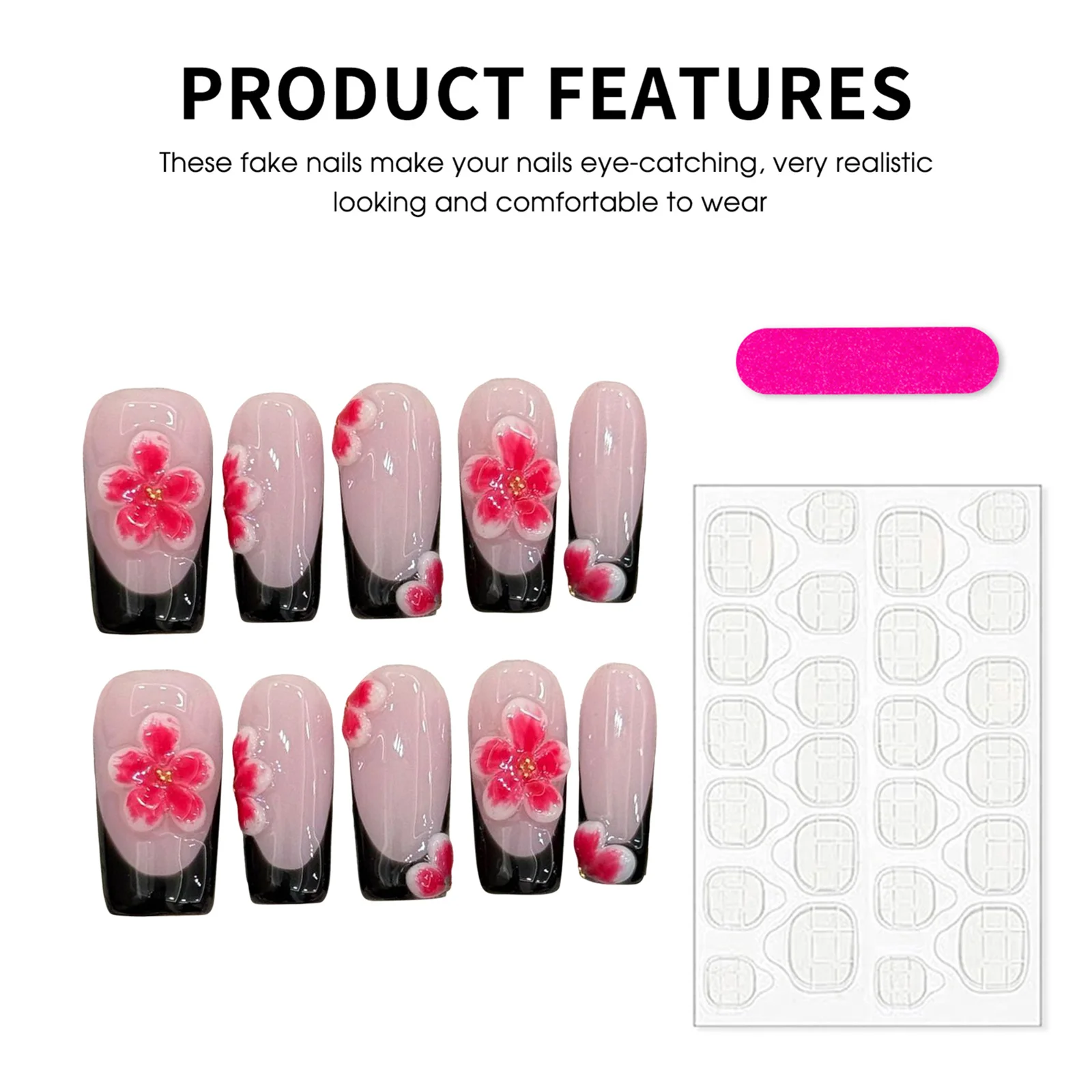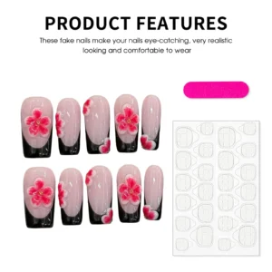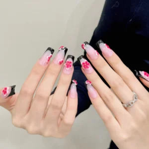 This striking set blends high-contrast color blocking with traditional floral motifs for a sophisticated, “Dark Romantic” aesthetic. The design features a delicate milky pink base paired with sharp, obsidian black French tips, creating a bold structural foundation.