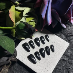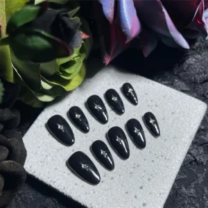 A celestial handmade press-on nail set in deep black with shimmering Milky Way star accents. The soft almond shape and glossy finish create an elegant, night-sky look that feels both mysterious and refined. Full-cover, lightweight, and reusable—perfect for evening wear, special occasions, or anyone who loves cosmic-inspired nail art with a subtle, sparkling glow. 🌌✨