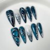 Designed for the girl who is both gentle and guarded, these short ellipse-shaped nails bring effortless elegance with a bold, modern edge. The transparent black base gives a smoky, glass-like effect, while fine shimmer catches the light with every movement — like stars scattered across midnight.