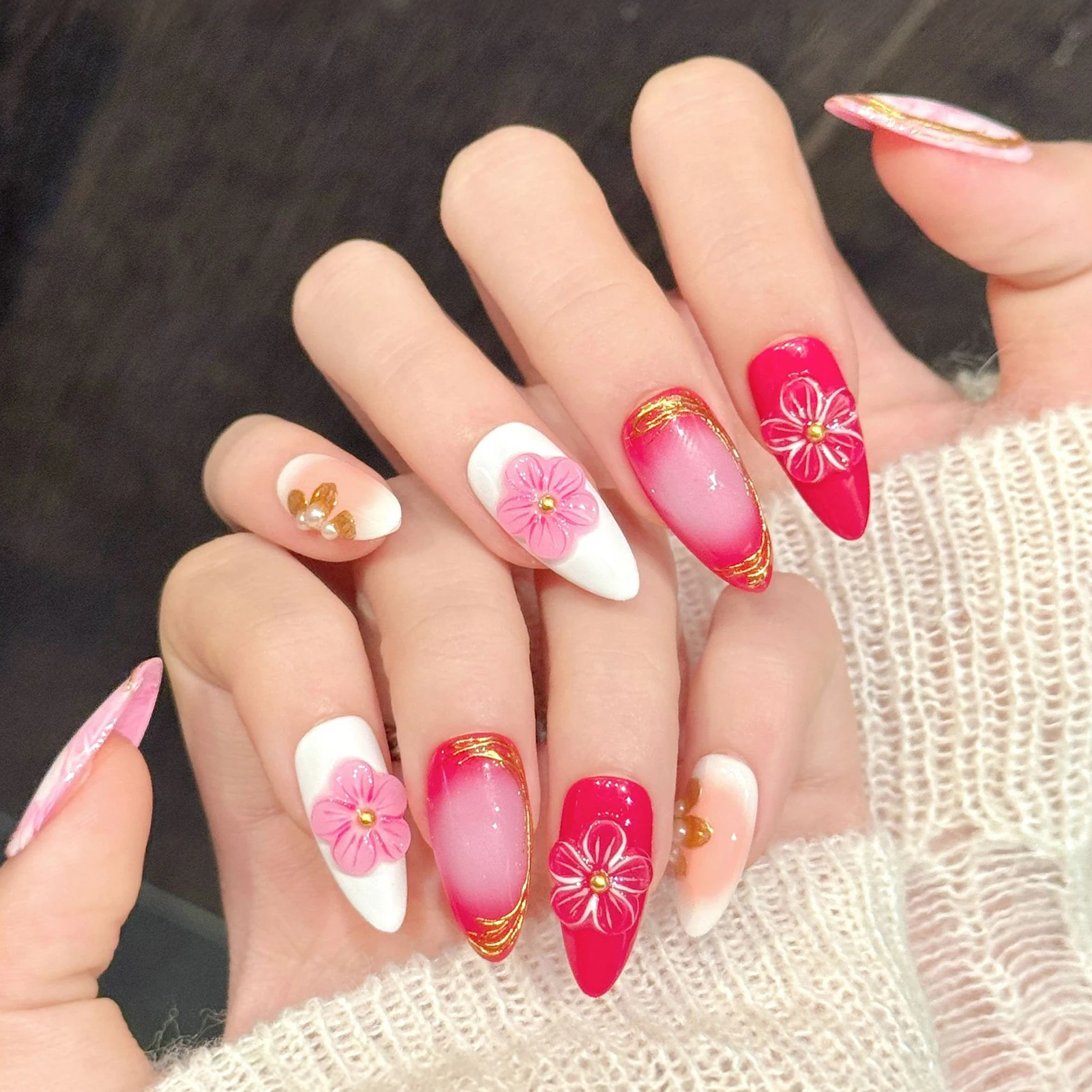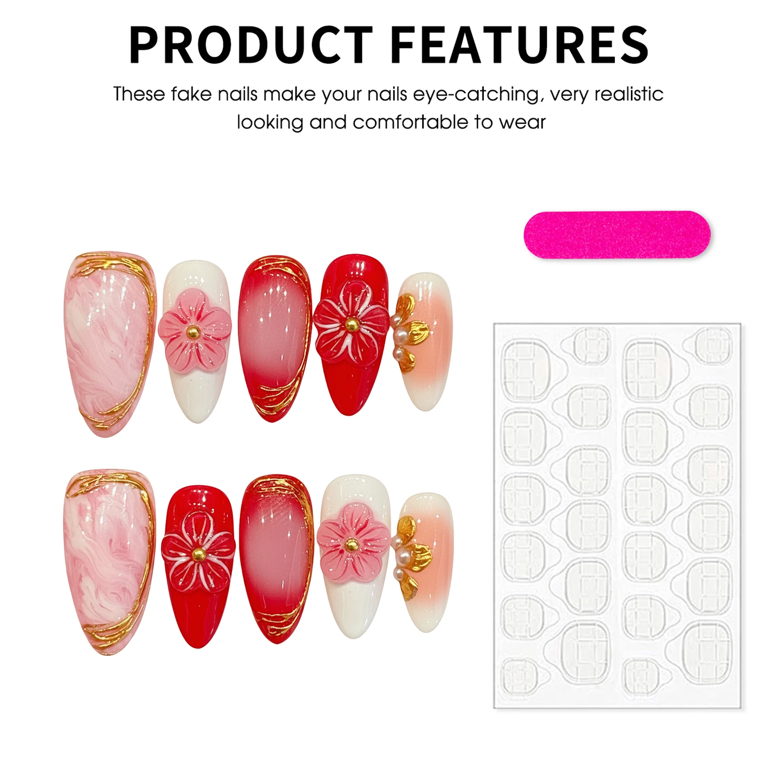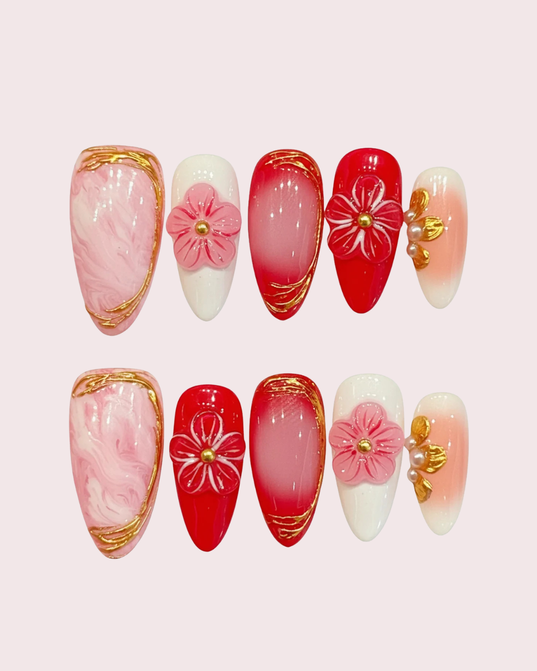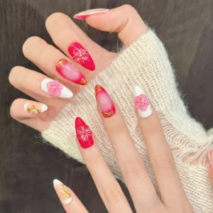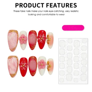 Embrace the delicate beauty of spring with this exquisite press-on nail collection, designed to bring a touch of floral sophistication to your fingertips. This set features a harmonious blend of soft blush marble and vibrant crimson tones, accented by shimmering gold leaf detailing that mimics the organic flow of nature. At the heart of the design are meticulously crafted 3D cherry blossom charms, paired with elegant pearl and gold embellishments that create a stunning, multi-dimensional look perfect for any special occasion.
