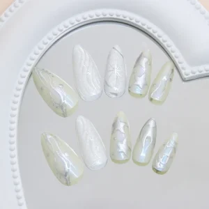 Designed with a full-cover detachable structure for easy, secure wear, these nails bring salon-level beauty straight to your hands. Perfect for nights out, special events, or adding a dreamy cosmic touch to your everyday style, Silver Stardrift turns every gesture into a subtle starlit moment.
