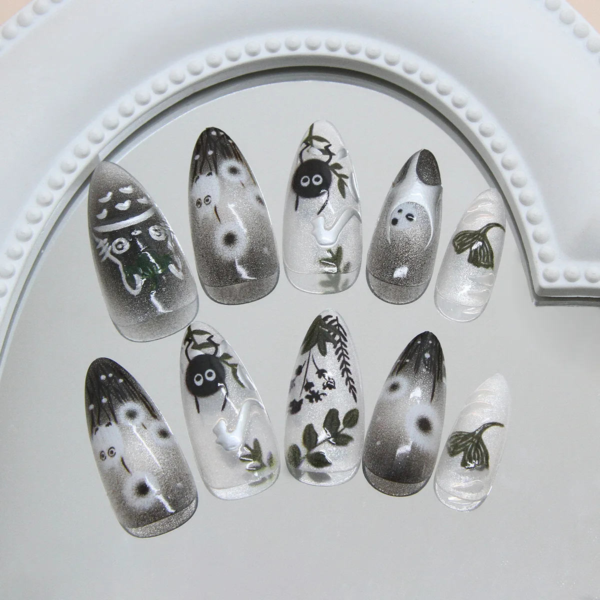Immerse yourself in a woodland fairytale with our Spirit of the Forest press-on set. This hand-crafted 10-piece collection brings the magic of the forest to your fingertips, featuring beloved characters like Totoro, mischievous Soot Sprites, and ethereal Kodama forest spirits.