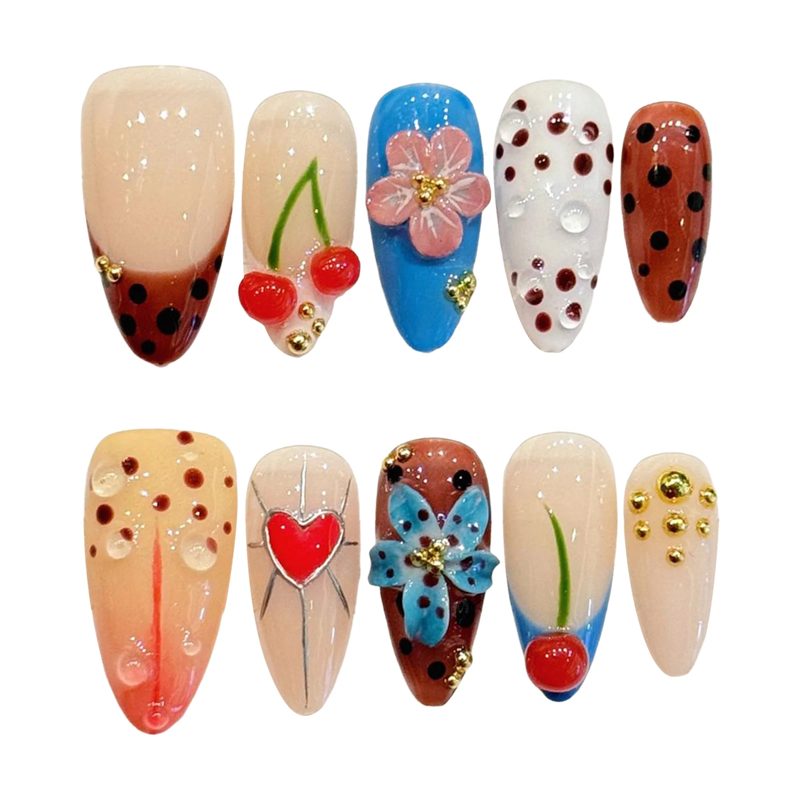 Embrace the “Sweet Cool” aesthetic with this vibrant 10-piece collection that perfectly balances youthful charm with a sophisticated edge. This set features a modern French-style base, providing a clean and polished canvas for high-contrast artistry. The design is centered around delicious, hand-sculpted 3D cherry carvings and delicate red love heart motifs, creating a playful and romantic look that stands out.